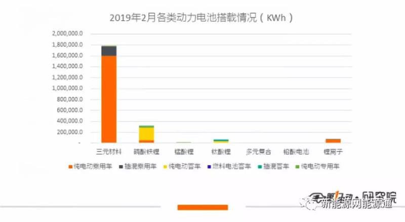 2月三元材料的搭載量為1.78GWh,其中乘用車占99.7%。三元材料搭載量占總搭載量的79.19 %,占比再次大幅提高。磷酸鐵鋰電池裝機(jī)320.4MWh,在月度裝機(jī)中的占比只有14.25 %。其中68.9%用于純電動(dòng)客車,純電動(dòng)乘用車和純電動(dòng)專用車的裝機(jī)量則分別占到18.5%和12.6%。錳酸鋰和鈦酸鋰電池2月合計(jì)裝機(jī)75.4 MWh,占比3.35%,其中鈦酸鋰電池全部由銀隆新能源提供且全部用在客車市場(chǎng)上。