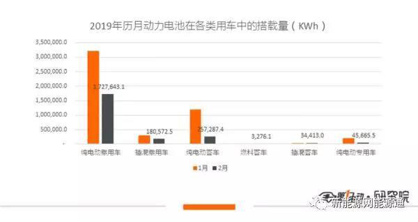 從車輛細(xì)分類別來(lái)看,2019年2月電動(dòng)汽車裝機(jī)量主要來(lái)源于純電動(dòng)乘用車。純電動(dòng)乘用車2月產(chǎn)量為37193輛,裝機(jī)量為1.73GWh,占總裝機(jī)量的76.9%,比1月提升了12個(gè)百分點(diǎn)。其他車輛細(xì)分市場(chǎng)表現(xiàn)平平,純電動(dòng)客車隨著產(chǎn)量的大幅縮水,2月裝機(jī)量只有0.26GWh。而產(chǎn)量只有240輛的純電動(dòng)專用車則只有45.7MWh。