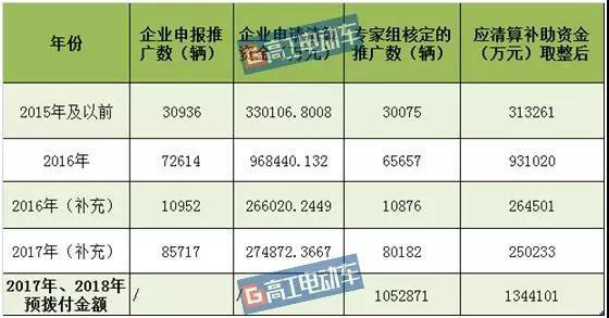 高工電動(dòng)車(微信號(hào):weixin-gg-ev)對(duì)清算文件整理發(fā)現(xiàn),終審和預(yù)撥付的補(bǔ)貼總金額高達(dá)310億元,其中186.8億元為2015年及以前、2016年、2017年的終審清算補(bǔ)貼,還有134.4億元為2017年、2018年的新能源汽車預(yù)撥款。