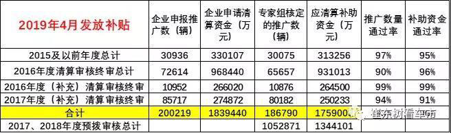 目前看,此次共發(fā)放2015年到2017年共4批新能源車補貼,企業(yè)申報數(shù)量共20萬臺,實際審核補貼18.6萬臺,通過率93%。企業(yè)申報資金183.9億元,審核清算資金達到175.9億元,通過率達到96%,總體表現(xiàn)較好。
