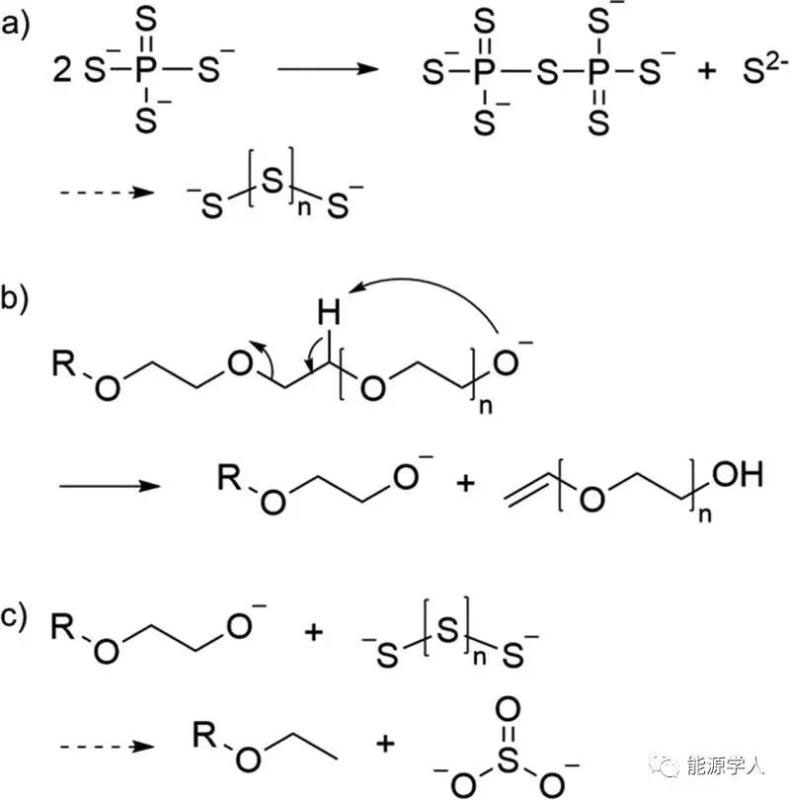 上圖中a)PS43-單位與P2S74-單位和多硫化物的反應(yīng);(b)PEO分子的內(nèi)部降解;(c)由(b)與(a)與亞硫酸鹽和聚合物碎片反應(yīng)生成的多硫化物??傊?,LSPS的降解機(jī)制從PS43-單元開始,釋放出的硫可以與聚硫化物發(fā)生反應(yīng),聚硫化物也是聚氧化乙烯(PEO)吸收的鋰離子;同時,該聚合物可能發(fā)生分子內(nèi)裂解,通過PEO與LiOH的脫核作用加速了分解,然后,生成的醇氧化物可能與多硫化物反應(yīng)形成亞硫酸鹽和其它低分子量的聚合物。