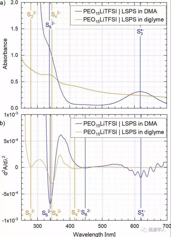 如果PEO15LiTFSI產(chǎn)生多硫化物,那么用紫外-可見光譜,即可表征出(上圖)。如上所述,二聚體和DMA的不同供體性質(zhì)導(dǎo)致了不同多硫化物種類的穩(wěn)定性不同。在二聚體中,紫外-可見光譜特征可歸因于S22?(280 nm)和S42?(345和420 nm),而S62?(338和448 nm)和S3??(618 nm)在DMA中被檢測到??傊?,以上紫外特征峰的出現(xiàn)是形成多硫化物的明確證據(jù)。