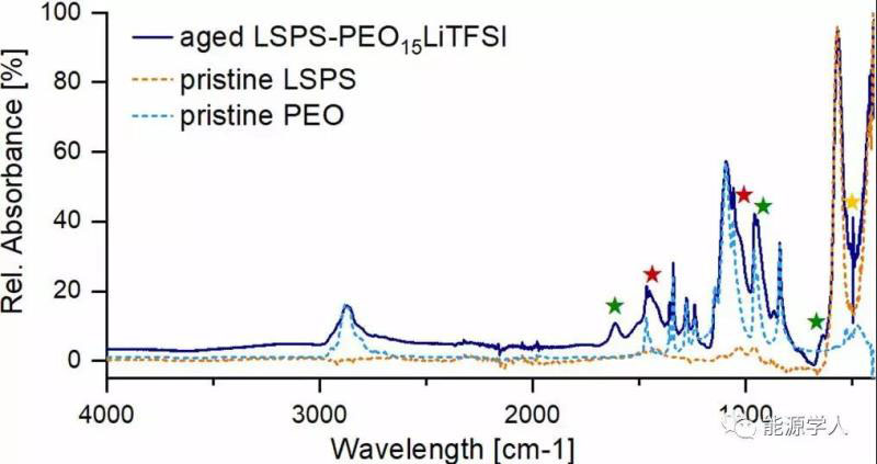 上圖為PEO15LiTFSI| LSPS樣品在60°C下老化7天后的FTIR對比,出現(xiàn)在1030 and 1420 cm?1的肩峰對應(yīng)著S=O振動(由紅星標(biāo)記),S–S多硫化物(以黃星為標(biāo)志)的拉伸振動通常產(chǎn)生500 cm-1左右的弱峰。然而,由于LSP中S-P和S-Sn帶的重疊很強(qiáng),都出現(xiàn)在400和570 cm?1左右,因此不可能明確確認(rèn)多硫化物的產(chǎn)生。635、905和1615 cm?1(綠星)處的強(qiáng)峰與C=C-H拉伸振動值相匹配,這表明聚合物的還原伴隨著氫或水的釋放。