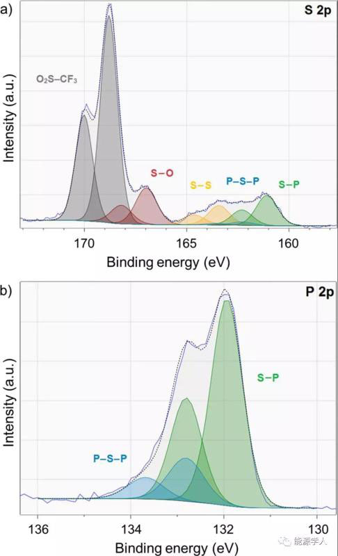 為了識別LSPS和PEO15LiTFSI之間的分解產(chǎn)物,作者對電池進(jìn)行拆解,并對老化界面進(jìn)行了研究。老化后界面的XRD圖與原來的LSPS和PEO15LiTFSI相同,表明反應(yīng)產(chǎn)物是非晶態(tài)的或是組成很小的部分。相比之下,XPS分析顯示,在60°C時,s 2p和p 2p光譜發(fā)生了明顯變化。如上圖所示,作者首先關(guān)注了硫原子的化學(xué)環(huán)境,s 2p譜有五個雙峰模擬信號,168.9 eV處的S 2p3/2,即圖a中灰色區(qū)域標(biāo)記的雙峰,表示LiTFSI中的[SO2-CF3];161.2 eV(綠色標(biāo)記)處的信號對應(yīng)于硫的最低氧化狀態(tài),源于LSPS的PS43?和SnS44?。P 2p的擬合需要考慮兩種結(jié)合態(tài),圖b中綠色區(qū)域標(biāo)記的132.0 eV(p 2p3/2)為主信號,為與硫呈四面體配位的磷,即LSPS中的PS43?。132.9 eV(藍(lán)色標(biāo)記)處的第二個信號可能來自P–[S]n–P,例如由P2S74?單元表示,相應(yīng)的S 2p3/2信號出現(xiàn)在162.9 eV處。請注意,由于p 2p區(qū)域的信號強(qiáng)度較小,且雙峰重疊明顯,因此量化涉及高度不確定性。