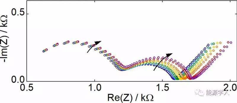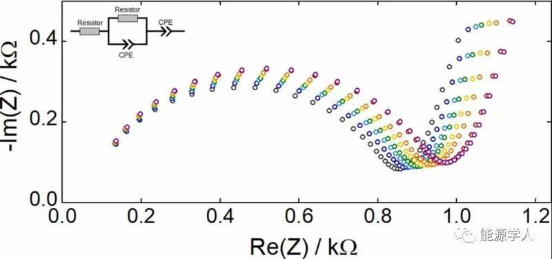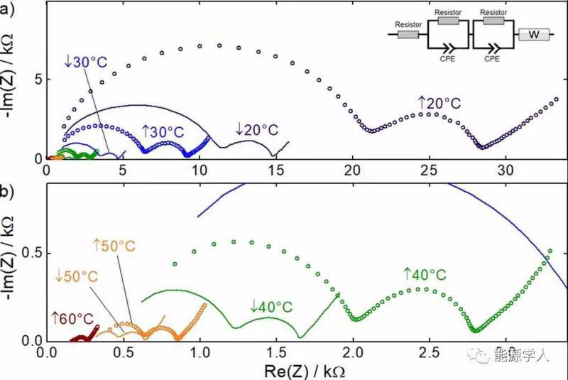 電池在首次加熱和冷卻循環(huán)時的阻抗譜(在每個溫度下保持約3小時)如上圖所示,在20°C時,接近29kΩ的初始高電阻是由電阻(iii)–(v)影響的。如同預(yù)期的一樣,電池在冷卻循環(huán)期間的EIS光譜顯示,電池的整體阻抗明顯低于加熱循環(huán)期間的電阻,這表明隨著溫度的降低,電池界面電阻降低。用于擬合實驗阻抗結(jié)果的等效電路如圖右上角所示,由于LSPS的體積和晶界電阻非常小,因此,它們很難被解析。電阻(iii)–(v)在Nyquist圖中顯示為半圓,因此由電阻和電容器的并聯(lián)電路建模。為了解釋固體-固體界面的非理想電容行為,如圖中半圓的凹陷所示,作者根據(jù)先前的文獻(xiàn),使用恒相元件(CPE)代替理想電容器。SE層間的半無限擴(kuò)散,在低頻區(qū)呈45°斜線,由Warburg擴(kuò)散進(jìn)行擬合。