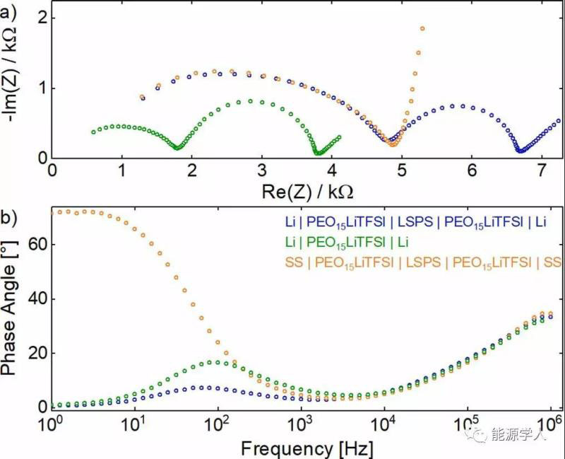 在高頻(HF)區(qū)域的半圓可以擬合為在nF范圍內(nèi)的電容,與HF過程中毫秒級的時間常數(shù)相對應(yīng)。相比之下,中頻(MF)區(qū)的半圓擬合出的電容在μF范圍內(nèi),相當(dāng)于微秒級的時間常數(shù)。為了明確分配(iii)–(v)的兩個過程,作者采用Li | PEO15LiTFSI | Li和SS | PEO15LiTFSI| LSPS | PEO15LiTFSI | SS電池進(jìn)行EIS測試,其中SS代表不銹鋼。上圖顯示了三種不同的電池在20°C下的Nyquist和Bode圖。圖a中的MF過程只能在含Li負(fù)極的電池中找到,因此可以歸結(jié)到Li | PEO15LiTFSI界面(iv),與先前報導(dǎo)一致。另一方面,圖b中的HF過程發(fā)生在所有電池中,表明它與聚合物層(iii)以及LSPS | PEO15LiTFSI界面(v)中的鋰離子輸運有關(guān)。