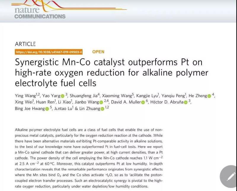 汪博士發(fā)表的論文正是與目前行業(yè)勢(shì)頭正火的燃料電池相關(guān)。其研究和開(kāi)發(fā)的堿性膜燃料電池陰極非貴金屬催化劑具有優(yōu)于貴金屬鉑的性能,可替代鉑類(lèi)貴金屬材料,打破了燃料電池核心材料長(zhǎng)期依賴(lài)國(guó)外進(jìn)口的局面,有助于實(shí)現(xiàn)燃料電池成本的降低,更好的實(shí)現(xiàn)燃料電池的自主產(chǎn)業(yè)化生產(chǎn)。