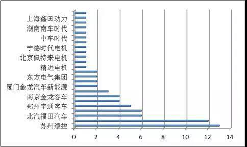 在這其中,蘇州綠控為13款車型配套電機(jī),數(shù)量最多;其次是湖南中車時代,為12款車型配套電機(jī)。另外,北汽福田汽車、廈門金龍旅行均為5款車型配套,位列第三。