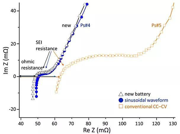 為驗(yàn)證弦波充電法對于電池內(nèi)部SEI膜阻抗的影響情形,研究人員利用電化學(xué)阻抗圖譜(EIS)對電池進(jìn)行分析,結(jié)果顯示使用此充電法進(jìn)行600次循環(huán)后的電池比起使用傳統(tǒng)CC-CV的電池,有效抑制了SEI膜的成長,并能保持與全新電池內(nèi)部阻抗相近的水平,說明此充電法對于鋰離子電池內(nèi)部材料結(jié)構(gòu)的破壞情形較小,而能提供電池更長的使用壽命,故此充電法將提供鋰離子電池產(chǎn)品使用者更好的選擇。