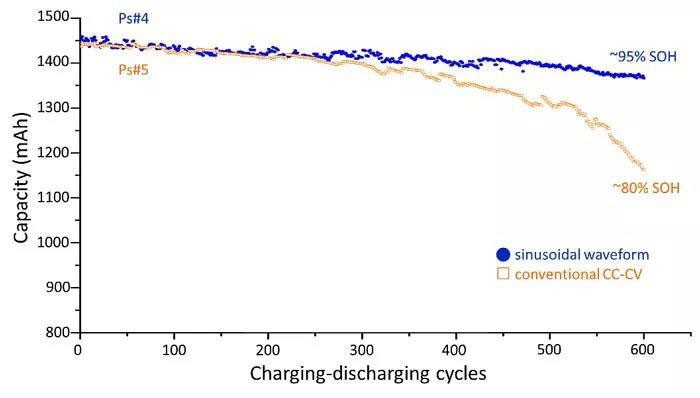 研究人員以電動車用電池容量低于80%就需汰換的標(biāo)準(zhǔn),來比較弦波充電法與傳統(tǒng)CC-CV充電法的電池電容量,并對電池以大電流充放電的方式來模擬電動車使用情境,由實(shí)驗(yàn)結(jié)果可發(fā)現(xiàn)傳統(tǒng)CC-CV充電法于600次循環(huán)后就達(dá)80%容量,而使用弦波充電法的電池還有剩余95%的電容量,說明弦波充電法對于電池使用壽命上有延長的功效。