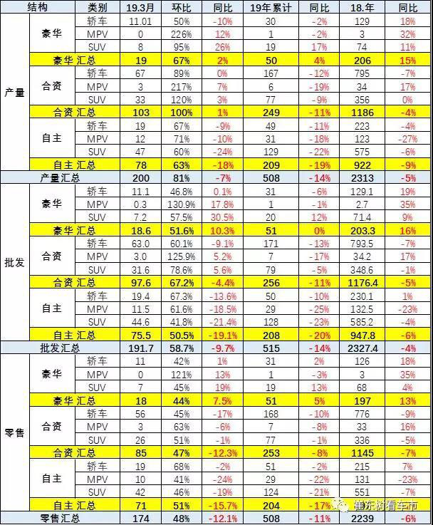 在3月生產中,豪華品牌的生產同比零增長,合資品牌增長1%,自主品牌負增長20%。19年1到3月份總體來看,豪華品牌生產同比增長5%,合資品牌和自主品牌生產同比下滑都是20%,