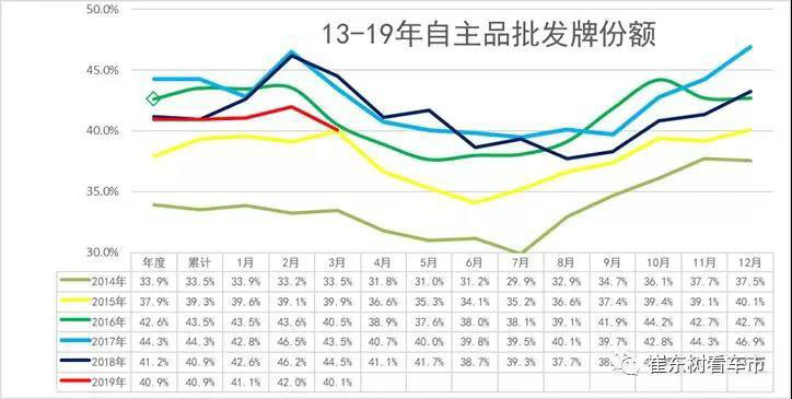 2009年3月份自主品牌份額40%,較16年、17年、18年的份額下降,增長壓力較大。19年3月的自主份額相對2月走弱。