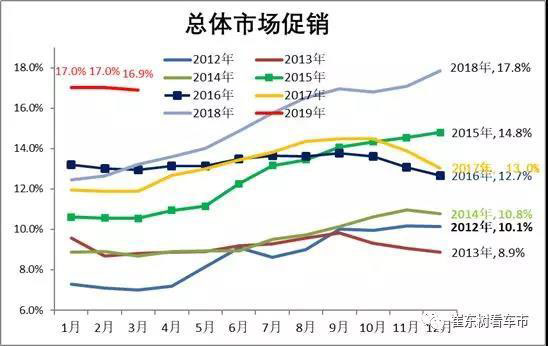 2016年車市促銷力度相對平穩(wěn),2017年處于前低中高,年末再度收縮的狀態(tài)。2018年車企促銷力度相對較大,尤其是4-12月份增長相對較猛。19年3月促銷沒有明顯加大的感覺,價格促銷力度較大。