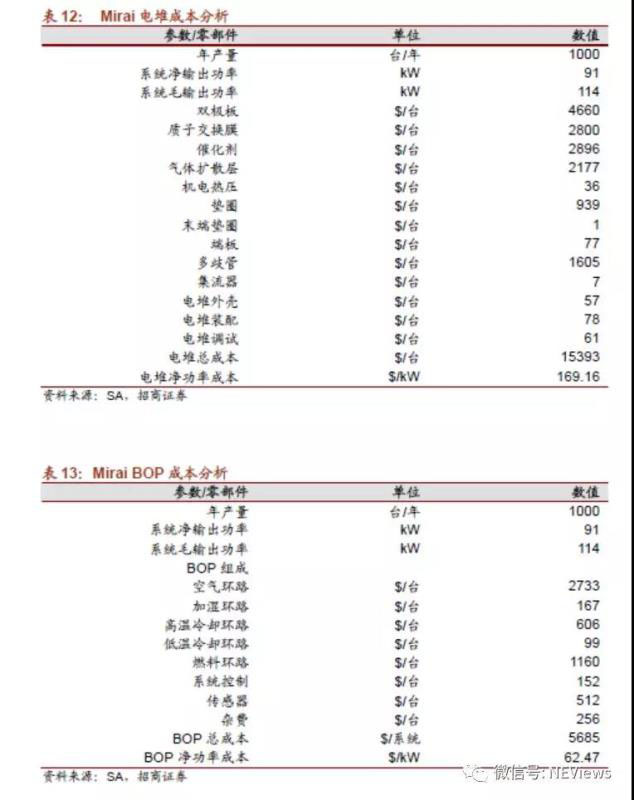 我們再以豐田的Mirai燃料電池為例,根據(jù)測算,Mirai燃料電池系統(tǒng)的成本達(dá)到233美元/W,其中73%的成本為電堆成本以114KW功率為標(biāo)準(zhǔn),1000臺產(chǎn)量下每臺Mirai的燃料電池系統(tǒng)成本為26562美元,2015年Mirai在美售價57500美元,在有補貼政策的情況下,每年銷量為2000多臺。如果產(chǎn)量達(dá)到10000臺,燃料電池系統(tǒng)成本將有望下降至9000美元,則基本上可以實現(xiàn)商業(yè)化。