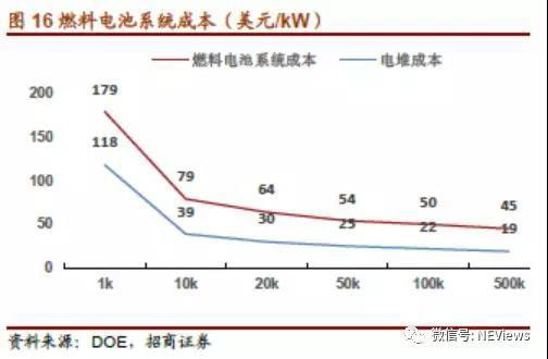在保證規(guī)模生產(chǎn)的前提下,乘用車燃料電池的成本基本可以達(dá)到商業(yè)化水準(zhǔn),隨著未來技術(shù)的進(jìn)步,燃料電池的成本有望進(jìn)一步下降。