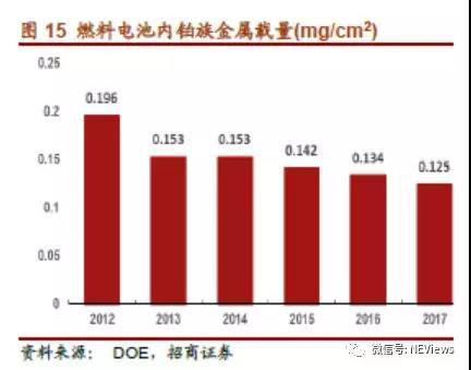 電催化劑的主要作用是促進(jìn)氫、氧在電極上的氧化還原過程。目前使用的電催化劑主要為鉑碳催化劑,由于鉑是一種貴金屬元素,材料成本占據(jù)主導(dǎo)地位的鉑碳催化劑無法通過量產(chǎn)來降低成本,使得電堆的成本居高不下。因此,未來燃料電池催化劑的研究方向應(yīng)向低鉑或無鉑催化劑的方向發(fā)展。但是,經(jīng)過多年的發(fā)展,燃料電池電催化劑鉑的擔(dān)載量已經(jīng)從2012年的0.196 mg/cm2下降到2017年的0.125mg/cm2,相信未來隨著技術(shù)的進(jìn)步鉑的擔(dān)載量將會進(jìn)一步降低。