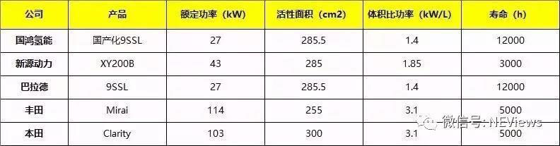 燃料電池乘用車若想能夠商業(yè)化,電堆的壽命至少需要超過5000-10000小時。巴拉德和國鴻氫能的9SSL燃料電池電堆壽命達(dá)到了12000小時,可以滿足乘用車對燃料電池壽命的使用要求。但是國產(chǎn)的9SSL電堆使用的是模壓石墨雙極板,這使得電堆的體積功率密度只有1.4KW/L,僅可用于商用車的應(yīng)用,無法滿足小型乘用車輕量化的需求。豐田的Mirai壽命雖只有5000小時,但是其電堆體積較小,體積功率密度高。下表是國際上幾家主要燃料電池堆生產(chǎn)商的電堆性能對比,從表中可以看出目前燃料電池堆的使用壽命已經(jīng)可以基本滿足商業(yè)化需求,但是在壽命的提高及材料的輕量化上仍然有很長的一段路需要走。