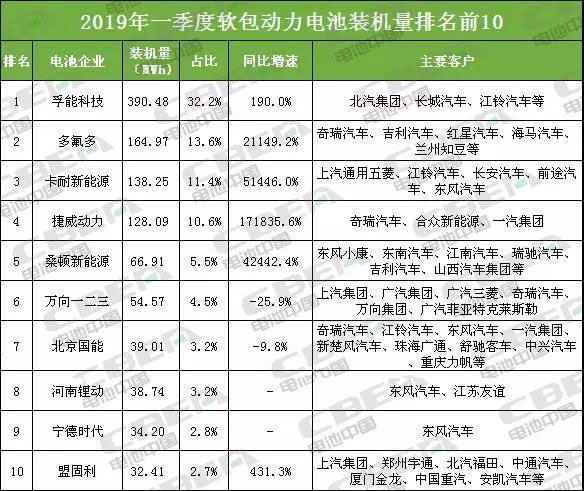 值得注意的是,2019年一季度多氟多、卡耐新能源、捷威動(dòng)力、桑頓新能源等4家企業(yè)的軟包電池裝機(jī)量同比暴增,分別增長(zhǎng)了21149.2%、51446.0%、171835.6%、42442.4%。