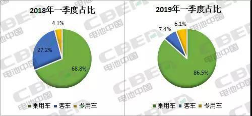 從軟包電池在各細(xì)分領(lǐng)域應(yīng)用來(lái)看,2019年一季度軟包動(dòng)力電池主要應(yīng)用在乘用車上,且占比提升較快。2019年一季度軟包動(dòng)力電池配套乘用車裝機(jī)量為1049.81MWh,占比達(dá)86.5%,較上年同期占比上升了近18個(gè)百分點(diǎn);配套客車裝機(jī)量為90.40MWh,占比7.4%,較上年同期下降了近20個(gè)百分點(diǎn);配套專用車裝機(jī)量為73.51MWh,占比6.1%,較上年同期上升了2個(gè)百分點(diǎn)。