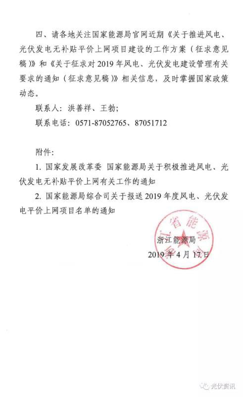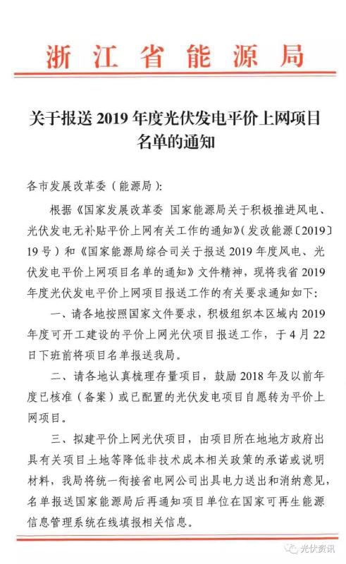 浙江省能源局下發(fā)《關于報送2019年度光伏發(fā)電平價上網(wǎng)項目名單的通知》,鼓勵2018年及以前年度已核準(備案)或已配置的光伏發(fā)電項目自愿轉為平價上網(wǎng)項目,要求于4月22日下班前將項目名單上報至省能源局。