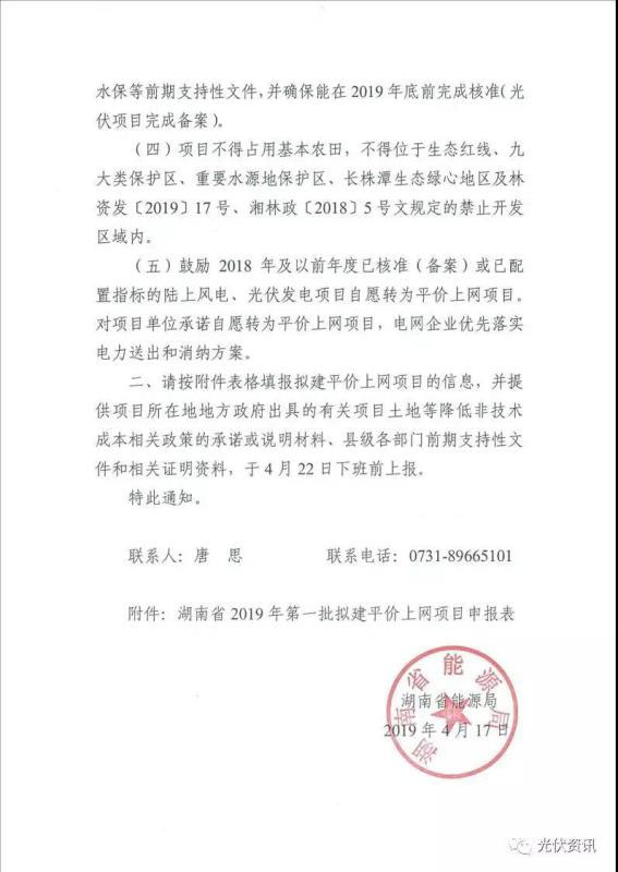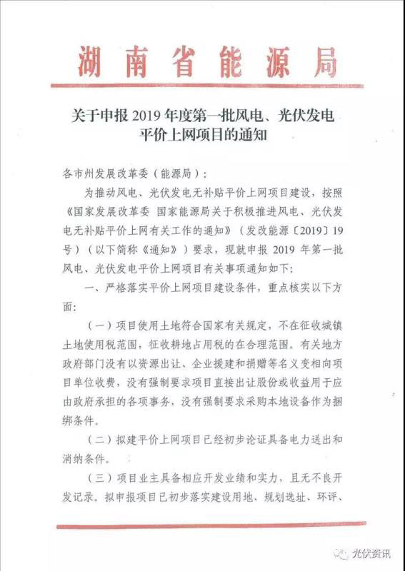 湖南省能源局下發(fā)《關于申報2019年度第一批風電、光伏發(fā)電平價上網(wǎng)項目的通知》,項目不得占用基本農(nóng)田,不得位于生態(tài)紅線、九大類保護區(qū)、重要水源地保護區(qū)、長株潭生態(tài)綠心地區(qū)及林資發(fā)<2019>17號、湘林政<2018>5號文規(guī)定的禁止開發(fā)區(qū)內。項目材料要求于4月22日下班前上報。