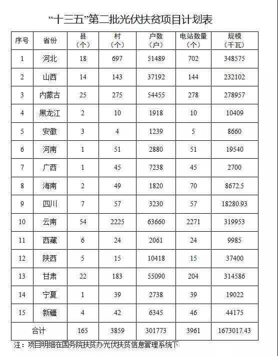 為貫徹落實《中共中央 國務(wù)院關(guān)于打贏脫貧攻堅戰(zhàn)的決定》和《中共中央 國務(wù)院關(guān)于打贏脫貧攻堅戰(zhàn)三年行動的指導(dǎo)意見》精神,扎實有序推進光伏扶貧工作,在各省(區(qū))申報光伏扶貧項目的基礎(chǔ)上,經(jīng)國務(wù)院扶貧辦、國家能源局聯(lián)合審核,現(xiàn)下達“十三五”第二批光伏扶貧項目計劃,有關(guān)事項通知如下。
