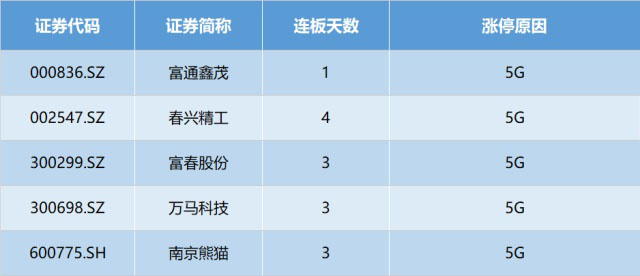 5G概念板塊今日沖高回落,再次小幅微漲。富通鑫茂(000836.SZ)、春興精工、富春股份、萬馬科技、南京熊貓等個股漲停。
