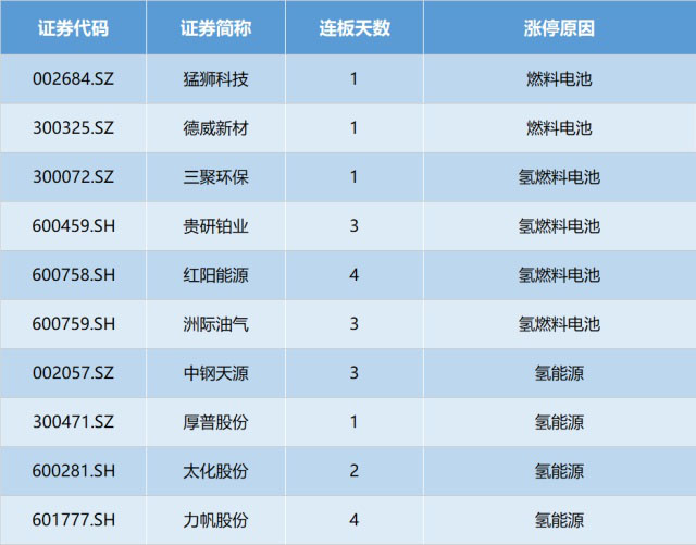 氫燃料電池板塊延續(xù)強(qiáng)勢,再次雄霸漲停榜,成為漲停榜上占比最多的板塊。紅陽能源、力帆股份霸氣四連板,其他個股猛獅科技(002684.SZ)、德威新材(300325.SZ)、三聚環(huán)保(300072.SZ)、貴研鉑業(yè)、洲際油氣、中鋼天源、厚普股份(300471.SZ)、太化股份(600281.SH)紛紛漲停。