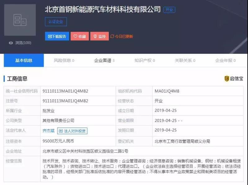 新能源汽車產(chǎn)業(yè)再迎強(qiáng)勁玩家,4月25日,北京首鋼新能源汽車材料科技有限公司正式成立,法定代表人為齊杰斌,注冊(cè)資本9.5億元人民幣。