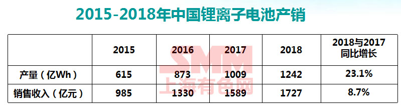 根據(jù)中國化學與物理電源行業(yè)協(xié)會統(tǒng)計分析,2018年中國鋰離子電池銷售收入達到1727億元,比2017年的1589億元,同比增長8.7%。鋰離子電池的產(chǎn)量由1009億瓦時增長到1242億瓦時,同比增長23.1%。主要是由新能源汽車動力電池和儲能電池市場的快速增長。