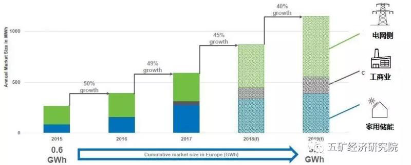 根據歐洲儲能協(xié)會最新發(fā)布的報告顯示,2017年歐洲電力儲能設備裝機容量接近600MWh,相比于2016年的400MWh增速高達49%。歐洲儲能市場呈現出電網端、工商業(yè)、戶用儲能“三強鼎立”的格局。歐洲電網側儲能商業(yè)模式很大程度上依賴于電網需求的大量波動及由此產生的經濟效益。但是近年來歐洲電網調頻需求并不旺盛,甚至有下降趨勢。但屬于用戶側的工商業(yè)儲能和家用儲能增速明顯高于電網端儲能,成為增長的主力軍。