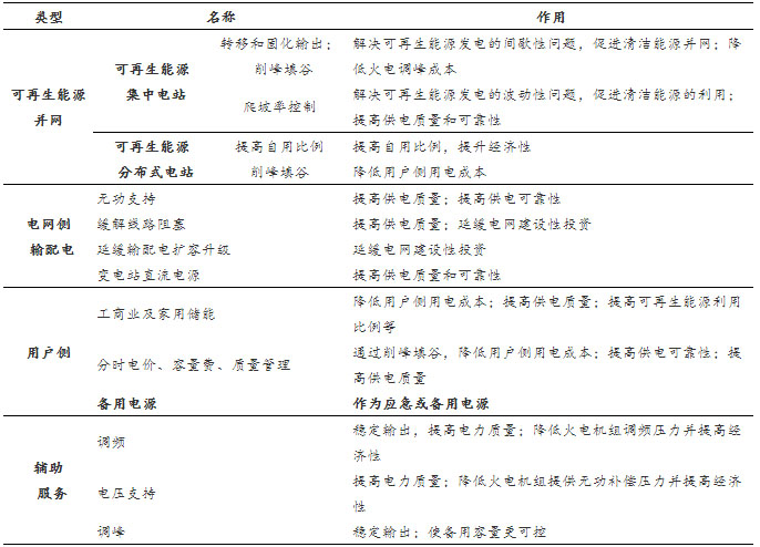 儲能可以被廣泛應用于發(fā)輸配用等各環(huán)節(jié),分類和作用如下表:
