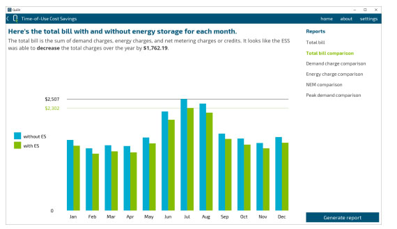 QuEST應(yīng)用程序的屏幕截圖:根據(jù)包括需求費用和凈計量信用在內(nèi)的各種指標(biāo),顯示了采用儲能項目和沒有采用儲能項目情況下的電力總費用