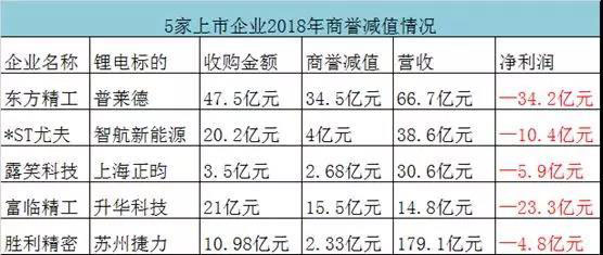 上述公司在公告中解釋稱,因新能源汽車補貼退坡導致子公司業(yè)績出現(xiàn)下滑,結合其目前經(jīng)營情況以及未來行業(yè)情況,公司認為因收購鋰電標的而形成的商譽存在減值跡象,因而計提商譽減值準備。