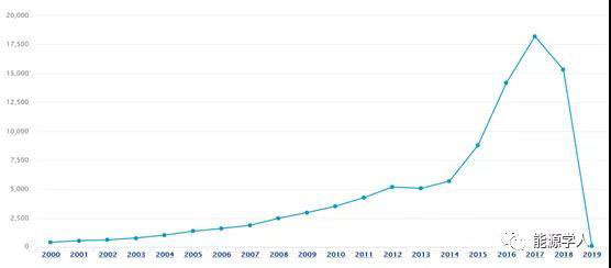 鋰離子電池作為電池行業(yè)中極為重要的領(lǐng)域,一直受到相關(guān)企業(yè)及科研院所的高度重視。如圖1所示為鋰離子電池全球?qū)@暾?qǐng)趨勢,可以看出,2000年至2008年全球鋰離子電池領(lǐng)域經(jīng)歷了緩慢的發(fā)展期,2009年至2013年的快速發(fā)展期,以及2012年至今的成熟期,2017年達(dá)到鋰離子電池專利申請(qǐng)的頂峰,單年專利申請(qǐng)數(shù)達(dá)到30000余件。
