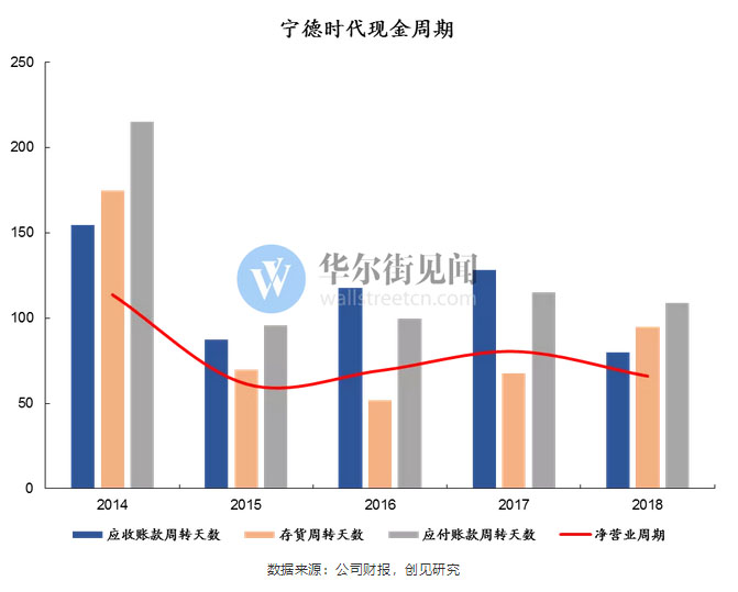 進一步拆解現(xiàn)金周期(凈營業(yè)周期)來看,寧德時代的應(yīng)收賬款周轉(zhuǎn)天數(shù)相對平穩(wěn),2018年甚至逆勢出現(xiàn)下降;應(yīng)付賬款周轉(zhuǎn)天數(shù)自2015年以來也呈上升趨勢,顯示其與供應(yīng)商的信任程度不斷加深。唯一美中不足的是存貨 周轉(zhuǎn)天數(shù)的增長,但對一家銷量呈指數(shù)增長的公司來說,一定程度的存貨堆積無傷大雅。