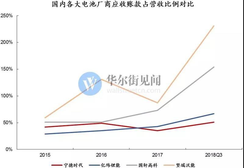 與國內(nèi)有代表性的三家高端玩家對比,補貼退坡對國內(nèi)電池廠商的毛利率影響顯而易見,但寧德時代在應(yīng)收賬款占營收比例一項顯示出了更為優(yōu)秀的議價能力。