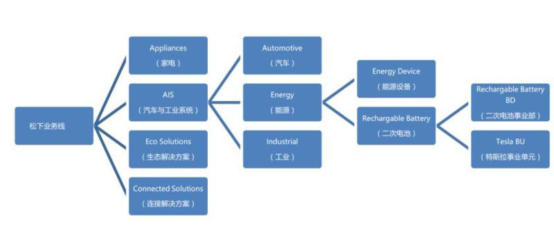 在松下如今的四大業(yè)務(wù)中,二次電池隸屬于AIS(汽車與工業(yè)系統(tǒng))的能源業(yè)務(wù)分支,旗下又細分為二次電池事業(yè)部與特斯拉事業(yè)單元兩大部門。