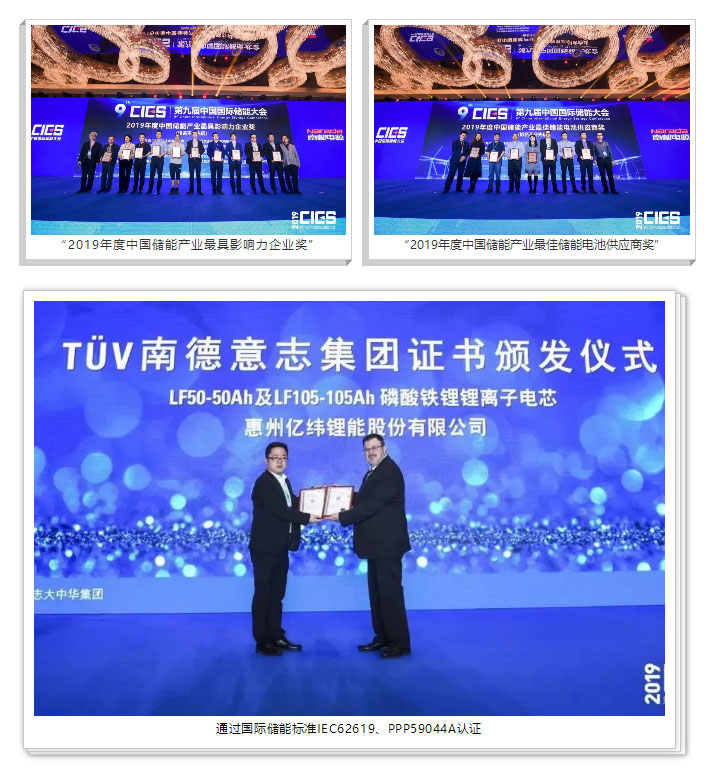 4月24日晚,在大會舉行的2019年度中國儲能產業(yè)最具影響力系列評選活動中,億緯鋰能榮獲“2019年度中國儲能產業(yè)最具影響力企業(yè)獎”、“2019年度中國儲能產業(yè)最佳儲能電池供應商獎”兩項大獎;并獲得了TüV 南德意志集團為公司鋰離子電芯頒發(fā)的證書,成為了當晚耀眼的明星企業(yè)。