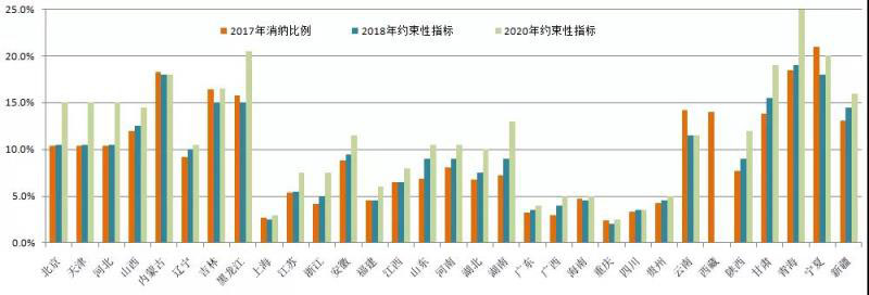 圖2:2017年可再生能源電力消納以及第三輪征求意見(jiàn)的2018、2020年非水可再生能源電力比例指標(biāo)