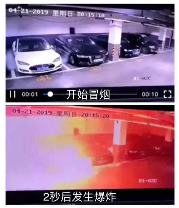 4月21日,特斯拉在地下車庫(kù)自燃的視頻監(jiān)控截圖