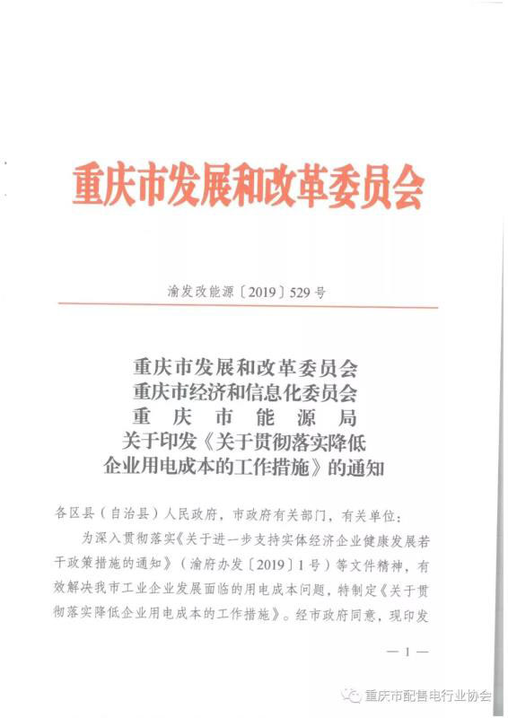 2019年4月28日,重慶市發(fā)改委、經(jīng)信委、能源局聯(lián)合印發(fā)了《關(guān)于貫徹落實(shí)降低企業(yè)用電成本的工作措施》(渝發(fā)改能源 [2019]529號,以下簡稱工作措施)的通知。該文件是落實(shí)重慶市政府一號文《關(guān)于進(jìn)一步支持實(shí)體經(jīng)濟(jì)企業(yè)健康發(fā)展若干政策措施》(渝府辦[2019]1號)的配套舉措。根據(jù)渝府辦[2019]1號的要求,從發(fā)電、輸配、政府基金及附加、用戶四端共同發(fā)力,將產(chǎn)品有市場的重點(diǎn)工業(yè)企業(yè)用電價(jià)格降低到0.6元/千瓦時(shí)左右?!豆ぷ鞔胧吩诖吮尘跋鲁雠_,強(qiáng)調(diào)了通過市場機(jī)制降低工商企業(yè)用電成本。注意到,文中強(qiáng)調(diào)的“成本”包含但并不局限于用電“價(jià)格”,而是從資產(chǎn)管理、優(yōu)化運(yùn)營、用戶服務(wù)等多維度為企業(yè)減負(fù),提升企業(yè)獲得感。