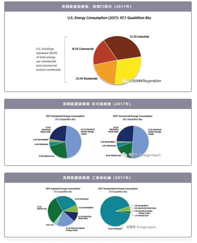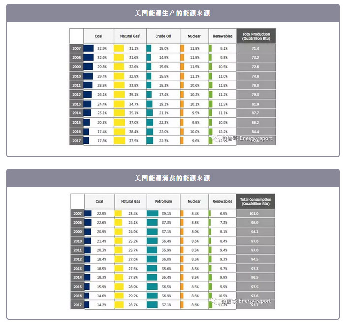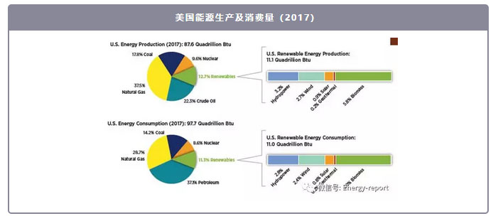 美國(guó)總體能源消費(fèi)量同比增加了0.2%,為97.7千兆英熱單位(Quadrillion Btu)。同2016年相比,2017年可再生能源和石油的能源消費(fèi)量分別增加7.4%和0.6%。相反,天然氣和煤炭的消費(fèi)量分別減少0.1%和0.6%。