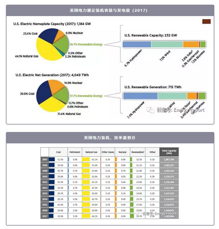 美國(guó)2017年可再生能源電力增至總裝機(jī)容量的19.7%以及總發(fā)電量的17.7%。在2017年,可再生電力裝機(jī)容量超過(guò)232吉瓦(GW),發(fā)電量為715太瓦時(shí)(TWh)。