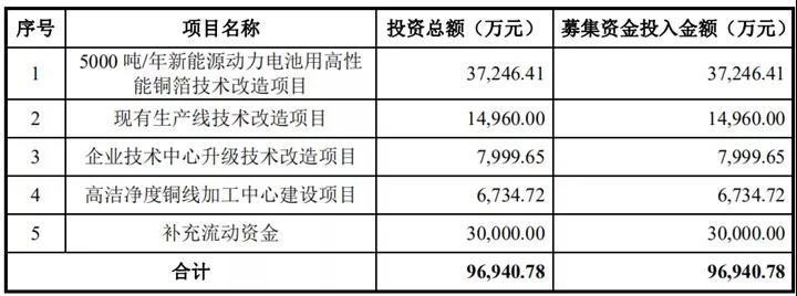 嘉元科技本次募集資金投資扣除發(fā)行費(fèi)用后,計(jì)劃用于5000噸/年新能源動(dòng)力電池用高性能銅箔技術(shù)改造項(xiàng)目、現(xiàn)有生產(chǎn)線技術(shù)改造項(xiàng)目、企業(yè)技術(shù)中心升級(jí)技術(shù)改造項(xiàng)目、高潔凈度銅線加工中心建設(shè)項(xiàng)目,以及補(bǔ)充流動(dòng)資金。