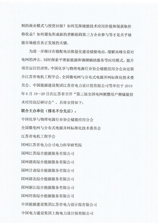 關(guān)于召開第三屆全國電網(wǎng)側(cè)暨用戶側(cè)儲能技術(shù)應(yīng)用高層研討會的通知