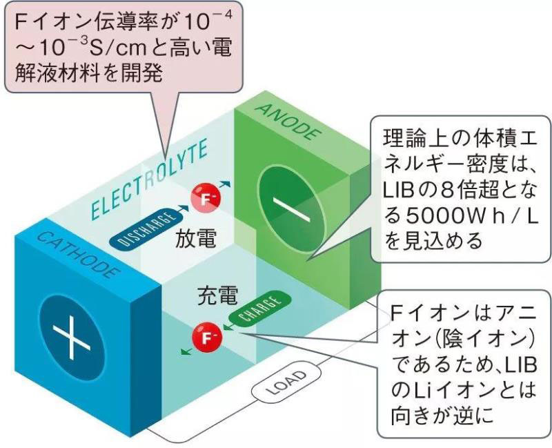 本田技研工業(yè)(本田)于2018年12月與美國(guó)宇航局及其他公司合作開(kāi)發(fā)了氟離子二次電池,這是一項(xiàng)突破,即使在室溫下也能開(kāi)發(fā)出具有高離子導(dǎo)電率的電解質(zhì)。F離子二次電池的體積能量密度為5000Wh/L,是鋰離子二次電池的8倍以上。如果它可以投入實(shí)際使用,社會(huì)影響非常高。