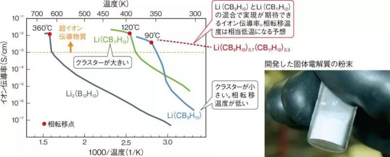 但是,它仍然高達(dá)90°C。金教授試圖以是與LiCB11H12和LiCB9H10混合固溶體提高不規(guī)則性降低相變溫度。結(jié)果,至少20℃以上不會(huì)發(fā)生相變,Li離子高傳導(dǎo)性的狀態(tài)被維持在一個(gè)寬的溫度范圍內(nèi)。鋰離子的傳導(dǎo)性在25℃時(shí)為6.7×10-3 S/cm,110℃時(shí)為和8.5×10-2 S/cm,相當(dāng)于硫化物基的材料。 “在我們目前的分析中,我們期望在相當(dāng)一個(gè)可以考慮的低溫度范圍內(nèi)不會(huì)相變,”金教授說(shuō)。