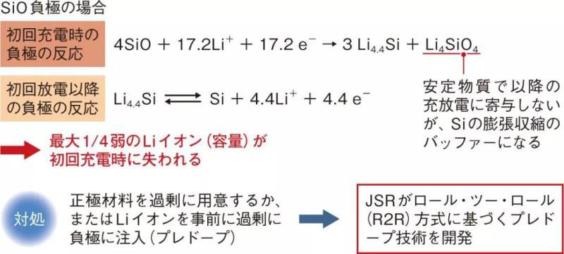 在許多Si基負(fù)極中,電池中的一部分Li離子與負(fù)極材料在初始充電時(shí)發(fā)生反應(yīng)并固化,因此存在容量大幅下降的問(wèn)題。作為對(duì)策,存在Li離子的預(yù)摻雜。JSR和其他公司已經(jīng)開(kāi)發(fā)出Li離子預(yù)摻雜的技術(shù)。