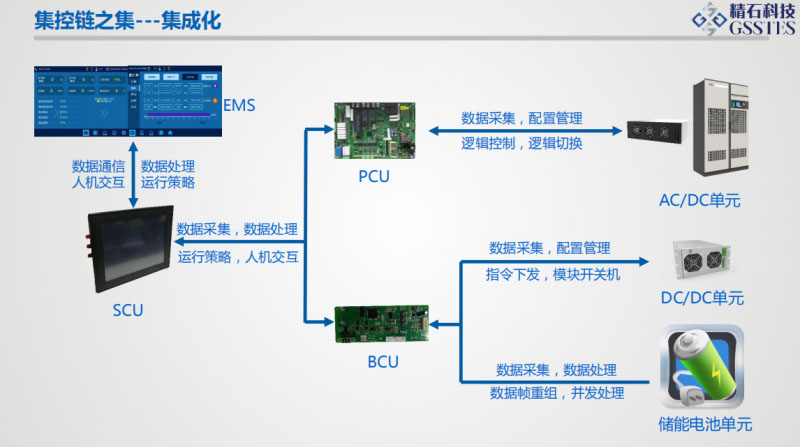 那么多電池、那么多控制器,如何實(shí)現(xiàn)它的安全、可靠、智能的控制?先看一下我們?yōu)槭裁唇凶黾劓湥^的集就是集成化,PCS內(nèi)部集成BCU、ECU、SCU,SCU對(duì)它進(jìn)行邏輯的控制,以及人機(jī)的交互,同時(shí)內(nèi)部還集成EMS的系統(tǒng)。這是他們內(nèi)部一個(gè)詳細(xì)的功能點(diǎn),大家可以看一下,BCU看的數(shù)據(jù)重組能夠保證40個(gè)電池包的數(shù)據(jù)并發(fā)處理以及下發(fā)指令,高效可靠。